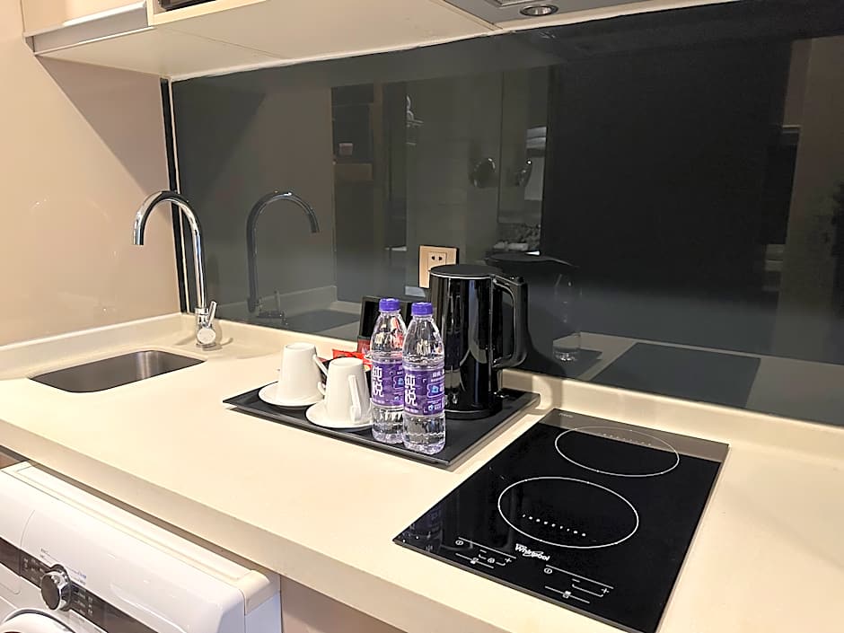 This apartment has a electric kettle, bathrobe and air conditioning.